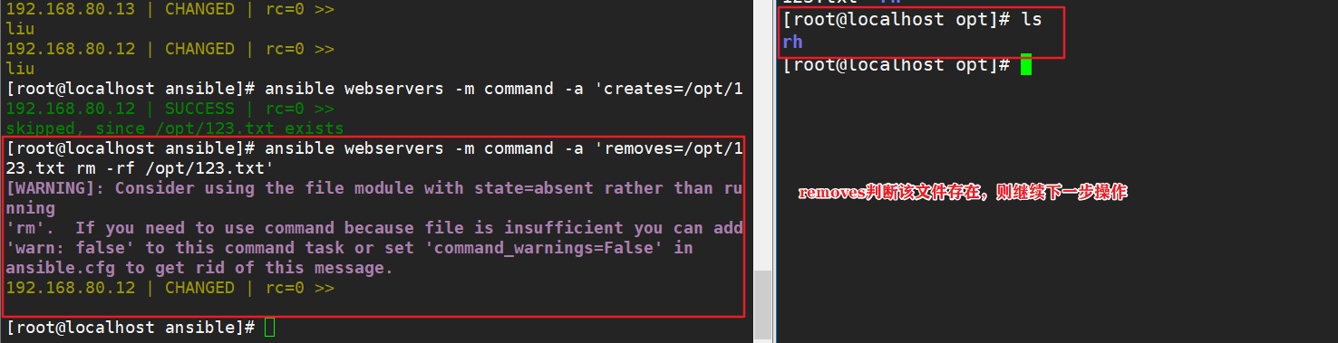 ansible dbservers -m file -a "path=/opt/abc.txt state=absent" #删除一个文件