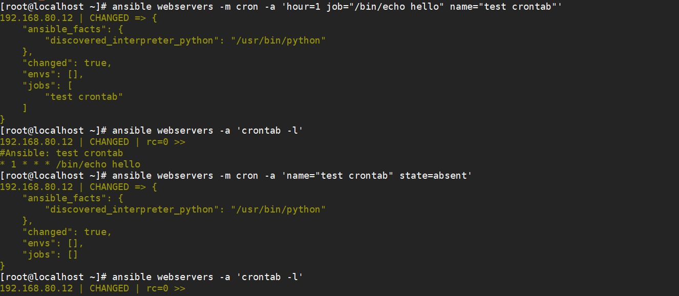 ansible webservers -m cron -a 'name="test crontab" state=absent' #移除计划任务,假如该计划任务没有取名字,name=None即可
