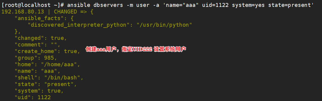ansible dbservers -m user -a 'name=test01 uid=306 system=yes group=mysql' #将test01用户添加到mysql组中