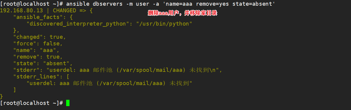 ansible dbservers -m user -a 'name="test01" state=absent' #删除用户test01