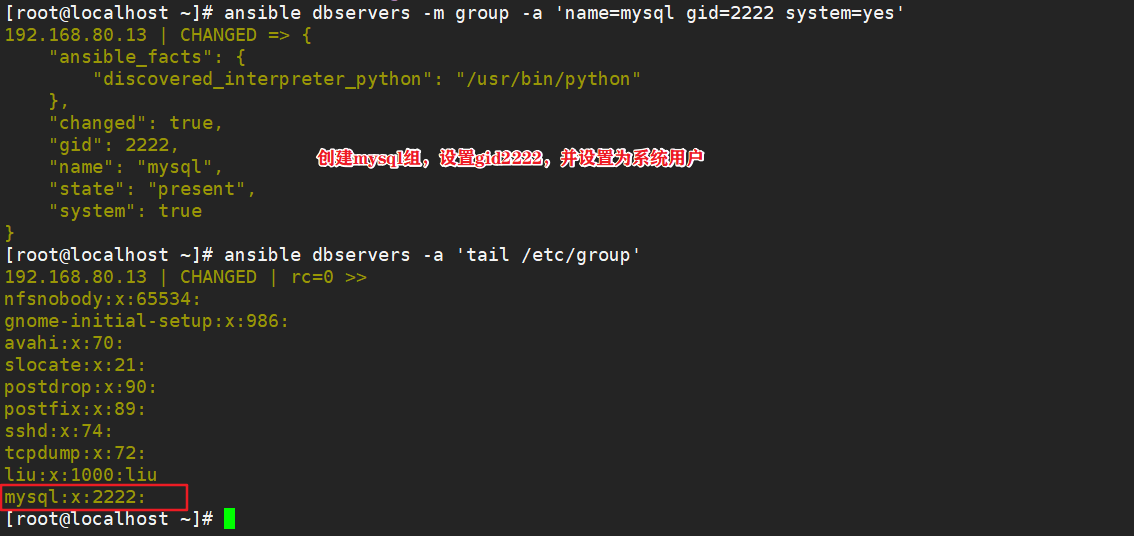 ansible dbservers -m group -a 'name=mysql gid=306 system=yes' #创建mysql组