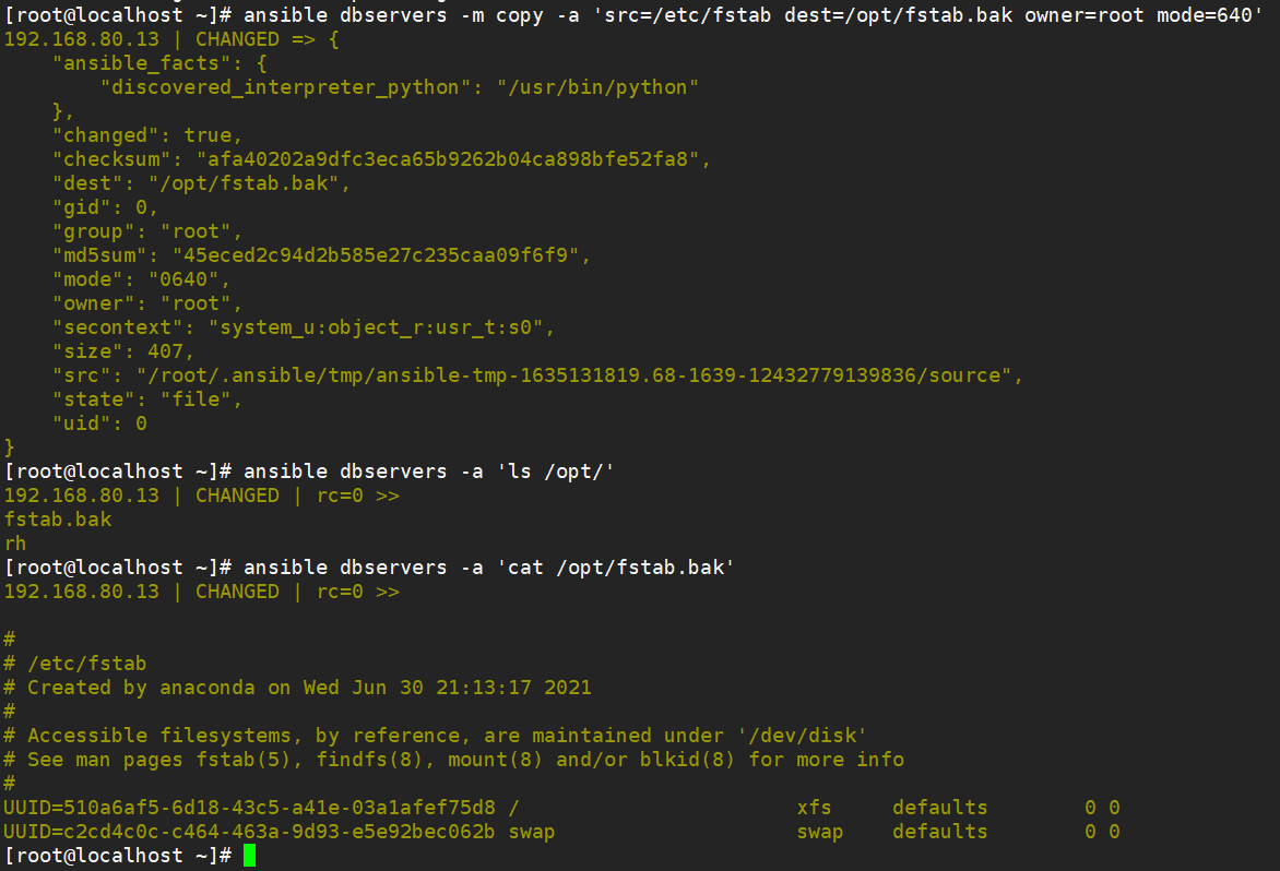 ansible dbservers -m copy -a 'src=/etc/fstab dest=/opt/fstab.bak owner=root mode=640'