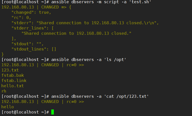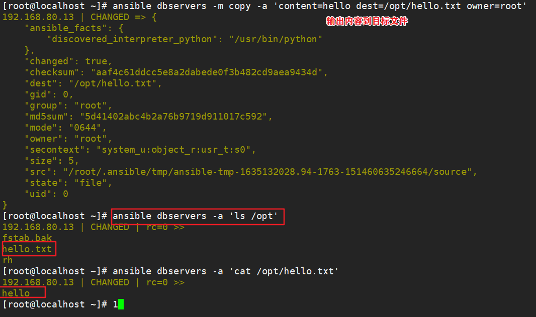 ansible dbservers -m copy -a 'content="helloworld" dest=/opt/hello.txt' #将helloworld写入/opt/hello.txt文件中