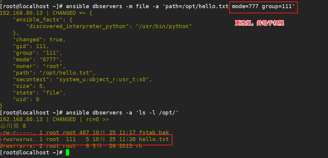 ansible dbservers -m file -a ' group=111 mode=777 path=/opt/hello.txt' #修改文件的属主属组权限等