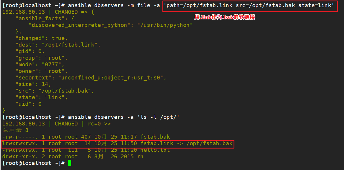 ansible dbservers -m file -a 'path=/opt/fstab.link src=/opt/fstab.bak state=link' #设置/opt/fstab.link为/opt/fstab.bak的链接文件
