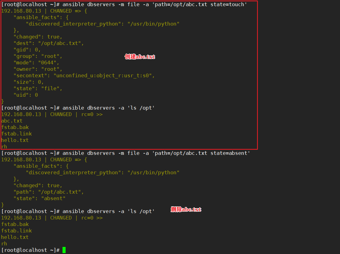 ansible dbservers -m file -a "path=/opt/abc.txt state=touch" #创建一个文件