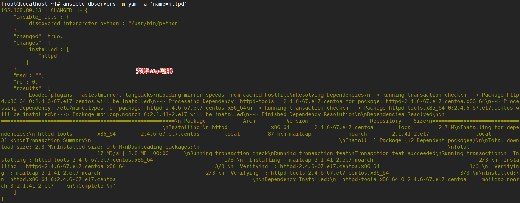 ansible webservers -m yum -a 'name=httpd' #安装服务