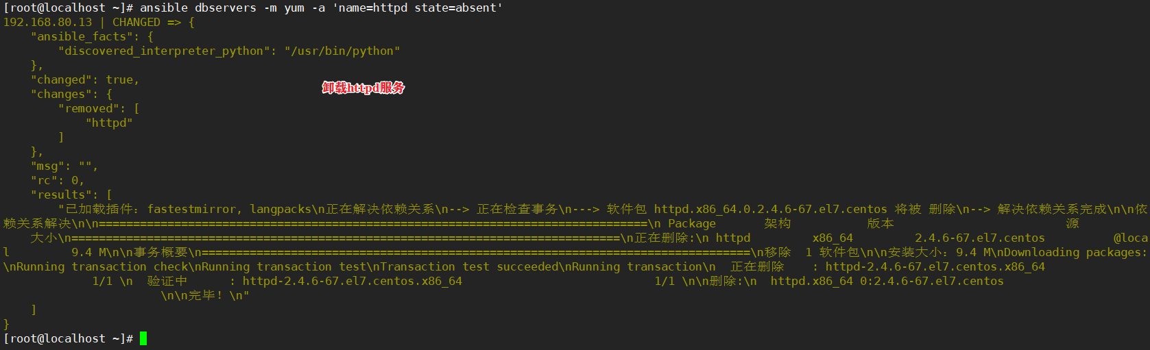 ansible webservers -m yum -a 'name=httpd state=absent' #卸载服务