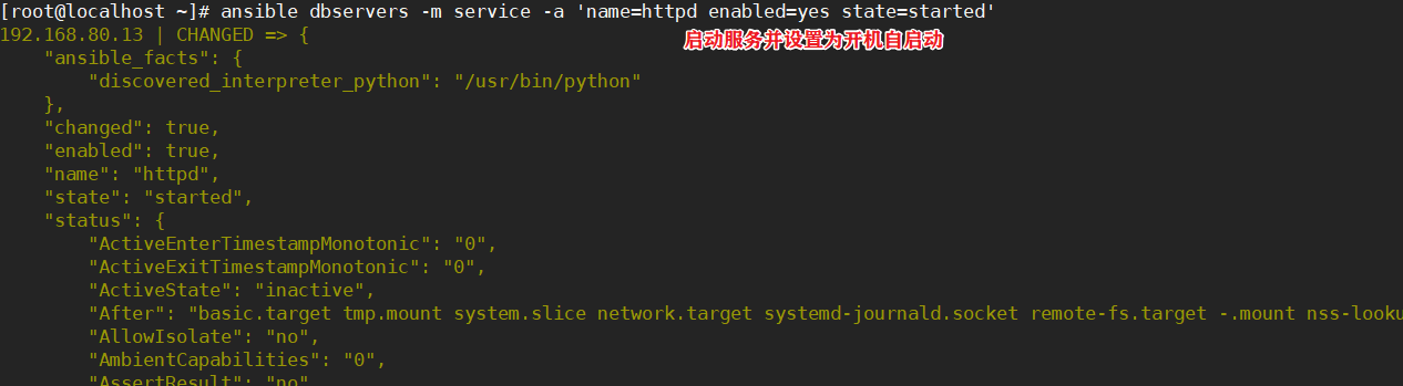 ansible webservers -m service -a 'enabled=true name=httpd state=started' #启动httpd服务
