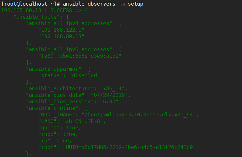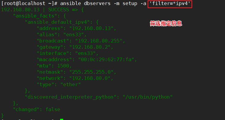 ansible dbservers -m setup -a 'filter=*ipv4' #使用filter可以筛选指定的facts信息