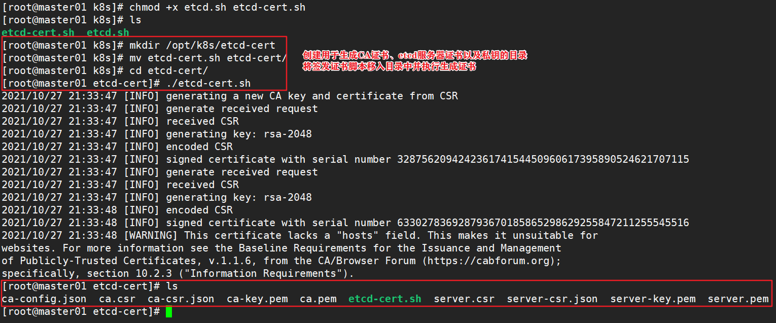 - 2.2.6、创建用于生成CA证书、etcd服务器证书以及、私钥的目录(在master节点上操作(192.168.80.11))
