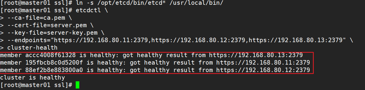- 2.2.9、把etcd相关证书文件和命令文件全部拷贝到另外两个etcd集群节点(在master节点上操作(192.168.80.11))
