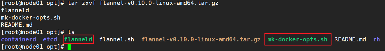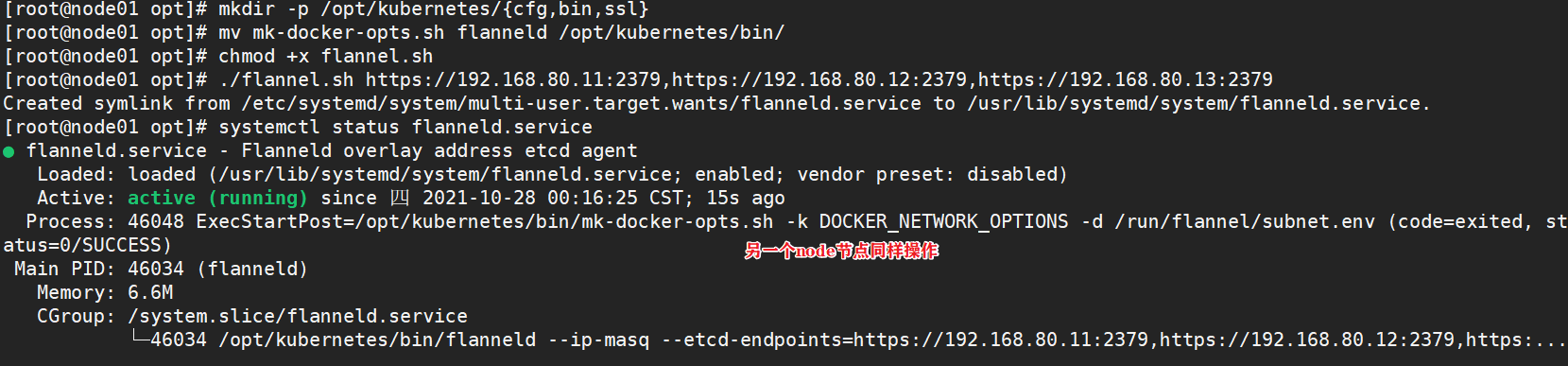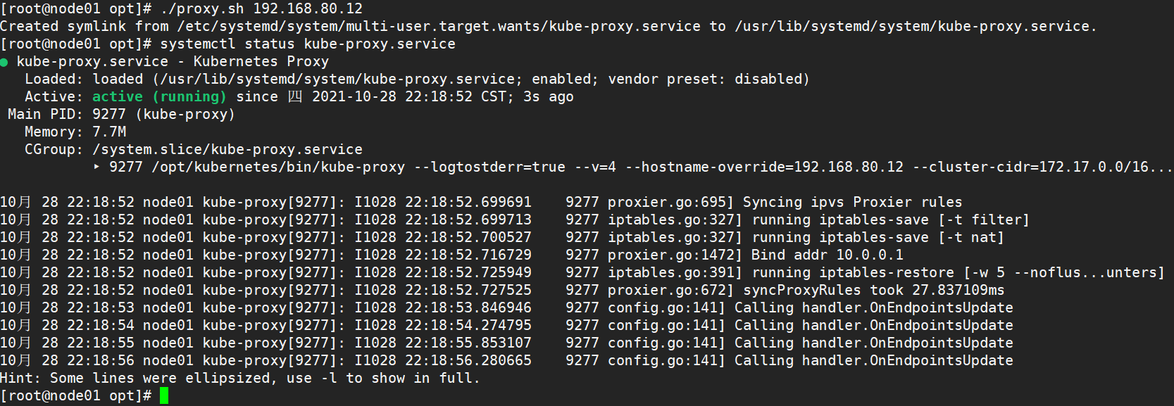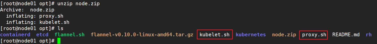 - 6.2、上传node.zip到/opt目录中,解压node.zip压缩包,获得kubelet.sh、proxy.sh(在node01节点上操作)