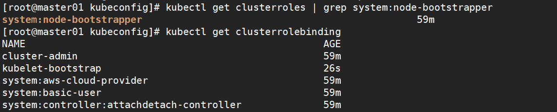 - 6.8RBAC授权,将预设用户kubelet-bootatrap 与内置的ClusterRole system:node-bootatrapper 绑定到一起,使其能够发起CSR请求(在master01节点操作)