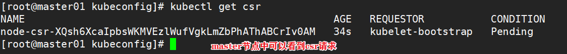 6.11、检查到node02节点的kublet发起的csr请求,pending表示等待集群给该节点签发证书(在master01节点上操作)