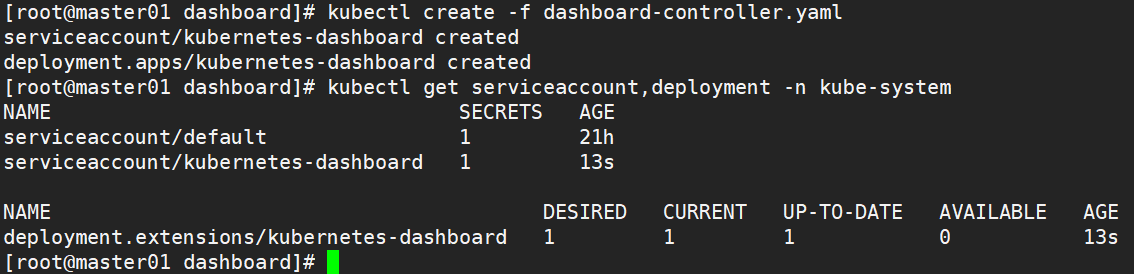 4、dashboard-controller.yaml:负责控制器及服务账户的创建,来管理pod副本
