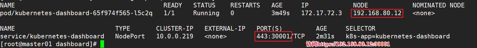 dashboard分配给了node01服务器,访问的入口是30001端口,打开浏览器访问 https://nodeIP:30001 来进行测试