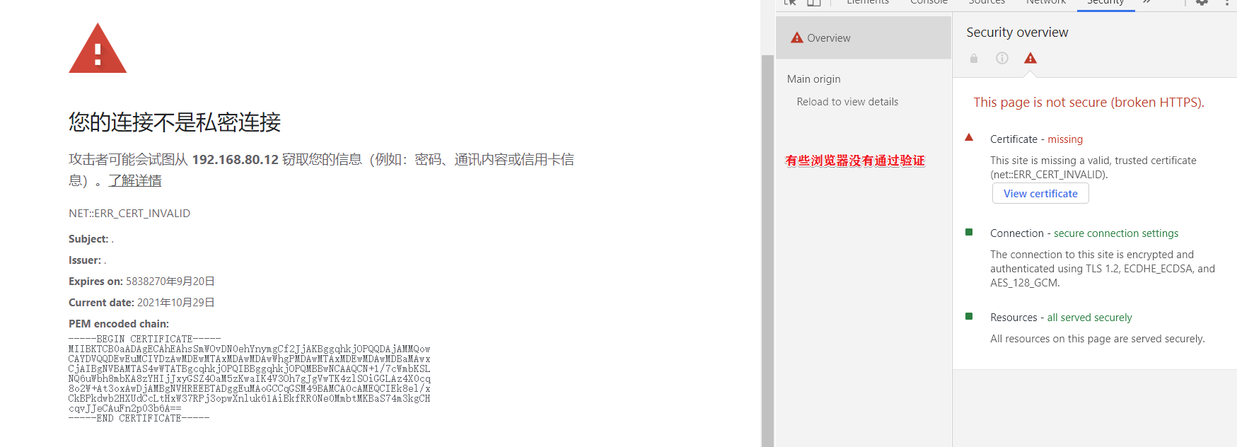 谷歌浏览器则因为缺少加密通信的认证证书,导致无法直接访问。可通过 菜单->更多工具->开发者工具->Security 查看访问失败的原因。