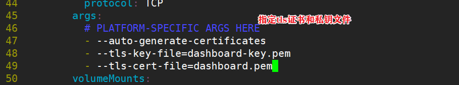 #在文件的第47行下面添加以下两行,指定加密(tls)的私钥和证书文件