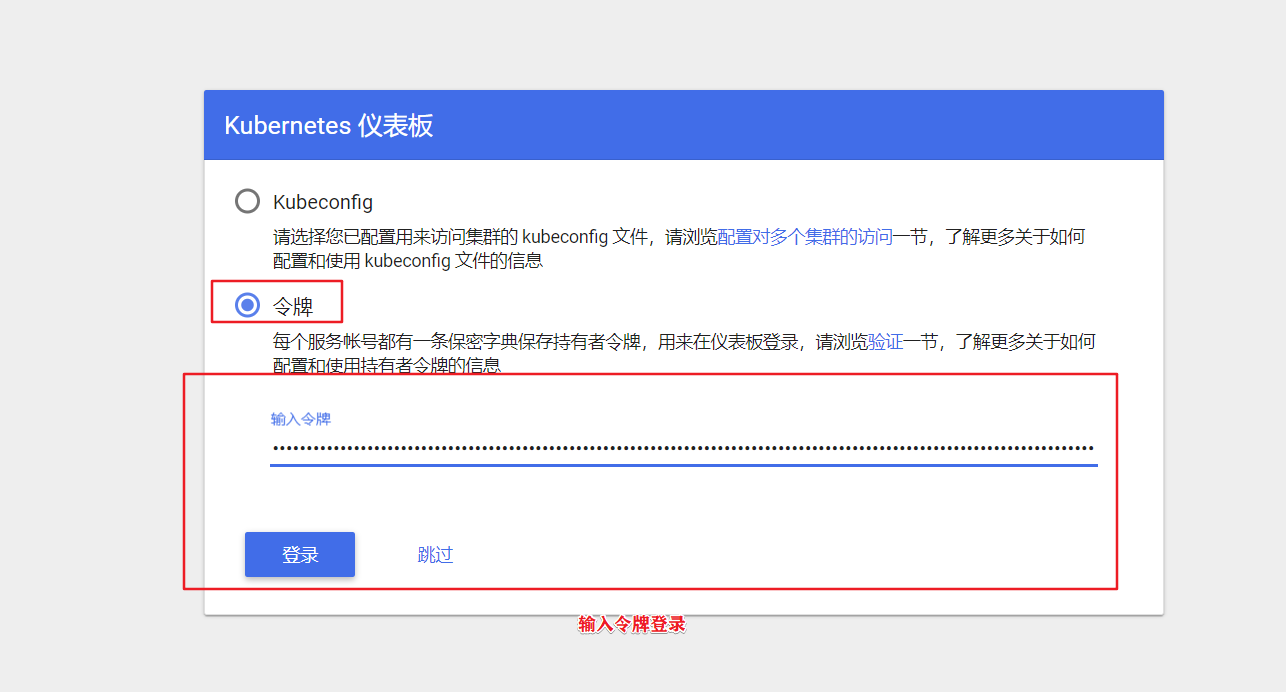 #2,浏览器访问https://192.168.80.13:30001 #输入token令牌验证登录
