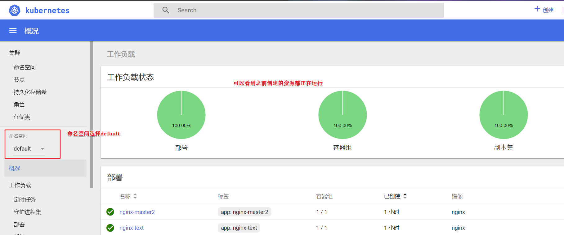 先通过 kubectl get pods 命令查看一下集群中是否有资源在运行,再在 Dashboard UI 界面中命令空间选 default,