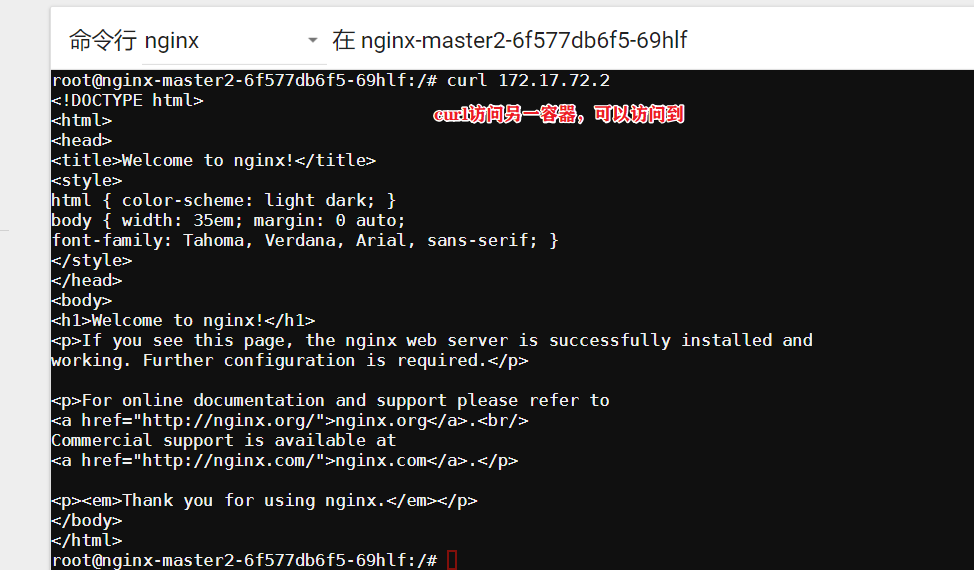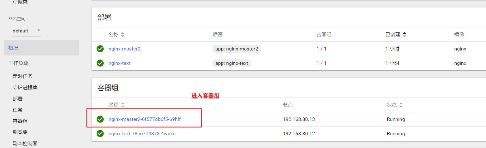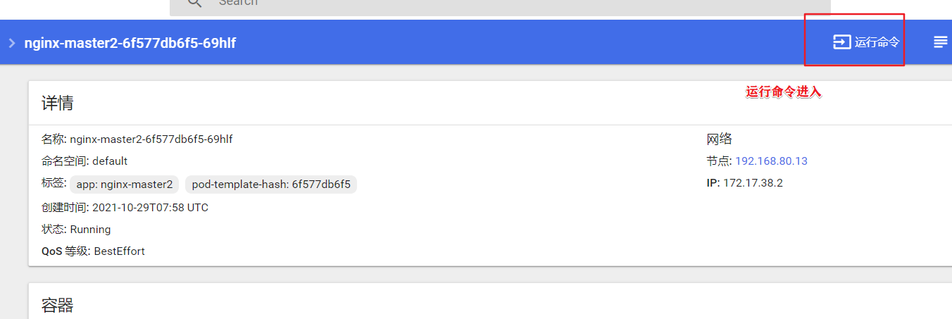 点击侧边栏中的“容器组”,点击容器名称,进入一个页面,点击右上方的“运行命令”或”日志“控件会弹出另一个额外页面,可在“运行命令”输入 curl <podip> 命令访问容器,再通过dashboard页面查看日志更新结果。
