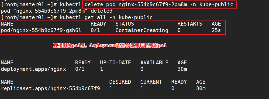 - 3.10、删除(重启)pod资源,由于存在deployment/rc之类的副本控制器,删除pod也会重新拉起来