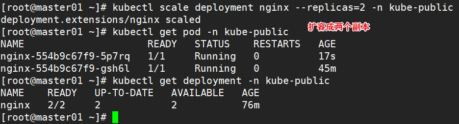 kubectl scale deployment nginx --replicas=2 -n kube-public #扩容