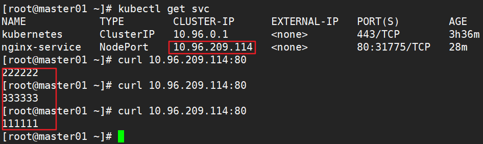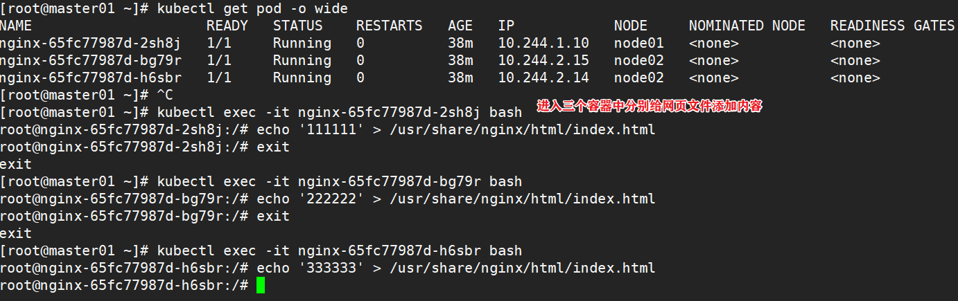 4.7、在master01主节点分别在3个pod内写入网页文件、浏览器访问clusterip和nodeport