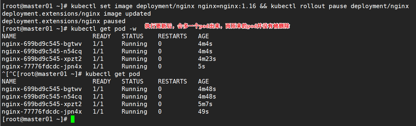 (2)监控更新的过程,可以看到已经新增了一个资源,但是并未按照预期的状态去删除一个旧的资源,就是因为使用了pause暂停命令