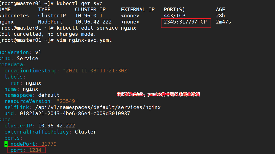直接使用kubectl edit service nginx 在线编辑资源配置清单并保存退出即时生效(如port:2345)