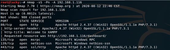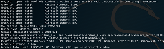 可以看到开放的端口有:80、135、139、443、445、3306、49152、49153、49154、49155、49156、49157