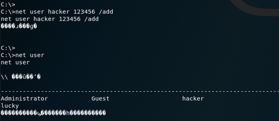 添加一个用户hacker,密码为123456:net user hacker 123456 /add