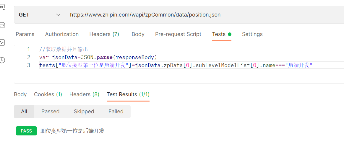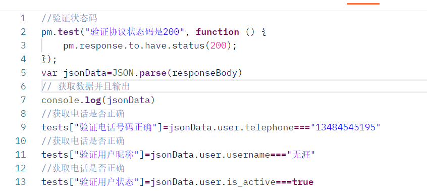 断言(assert)在postman里面,写assert的地方是tests 如: