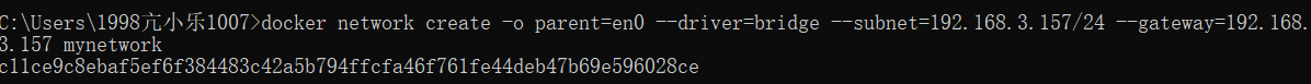docker network create -o parent=en0 --driver=bridge --subnet=192.168.3.157/24 --gateway=192.168.3.157 mynetwork