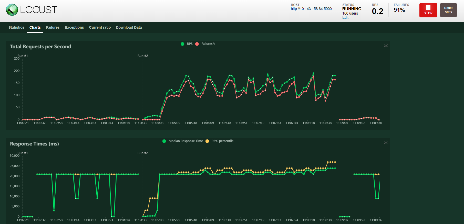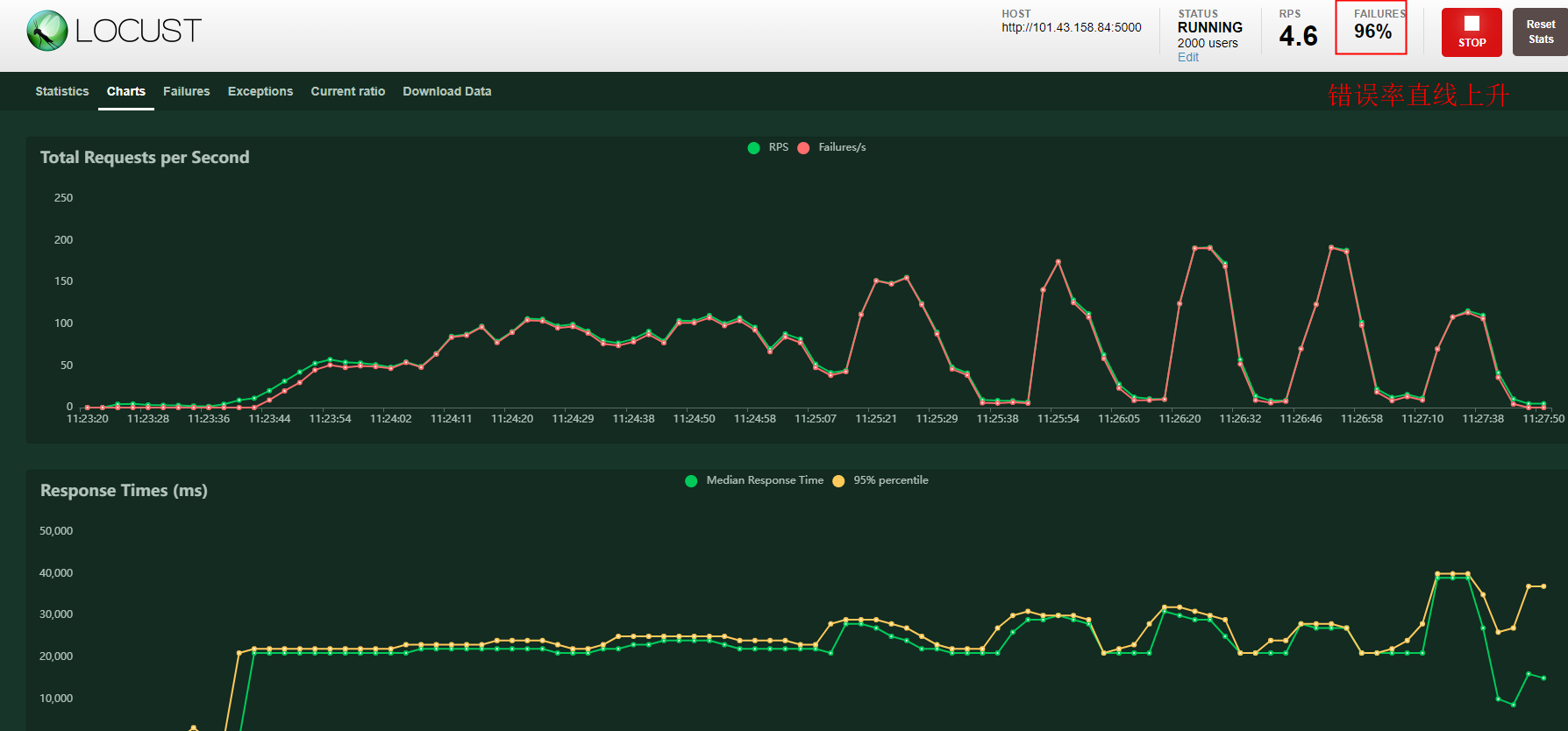 Charts:测试结果变化趋势的曲线展示图,分别为每秒完成的请求数(RPS)、响应时间、不同时间的虚拟⽤户数;