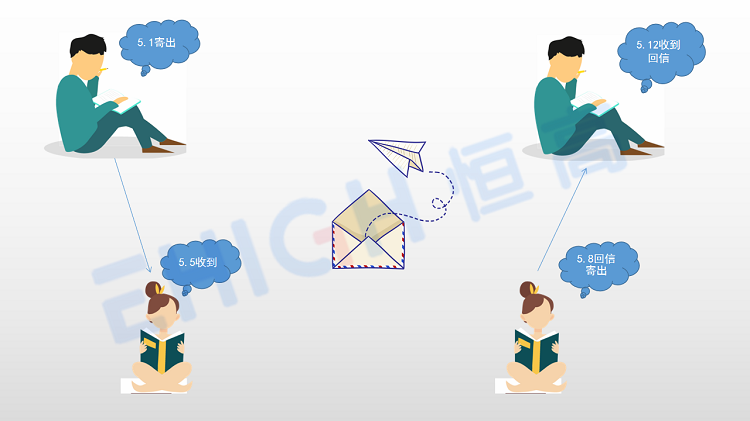 那么问题来了,标签和基站之间的飞行时间如何计算呢?在“从前的日子过得慢,车、马、邮件都慢”的年代,写信是主要的通讯工具,下图所示A在5月1日给B写了一封信,B在5月5日收到且在5月8号将回信寄出,A在5月12日收到B的回信,根据A和B收发信件的时间差,就可以计算出邮政局的工作效率啦。