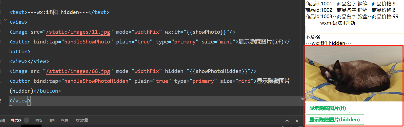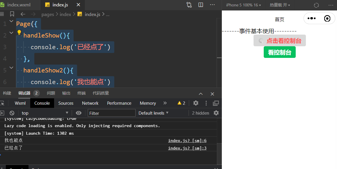 1 vxml 2 3 4 <!--index.wxml--> 5 <view>-------事件基本使用---------</view> 6 7 <button size="mini" type="warn" loading bind:tap="handleShow">点击看控制台</button> 8 9 <button size="mini" type="primary" bindtap="handleShow2">看控制台</button> 10 11 12 ***************************** 13 index.js 14 15 Page({ 16 handleShow(){ 17 console.log('已经点了') 18 }, 19 handleShow2(){ 20 console.log('我也能点') 21 }, 22 })