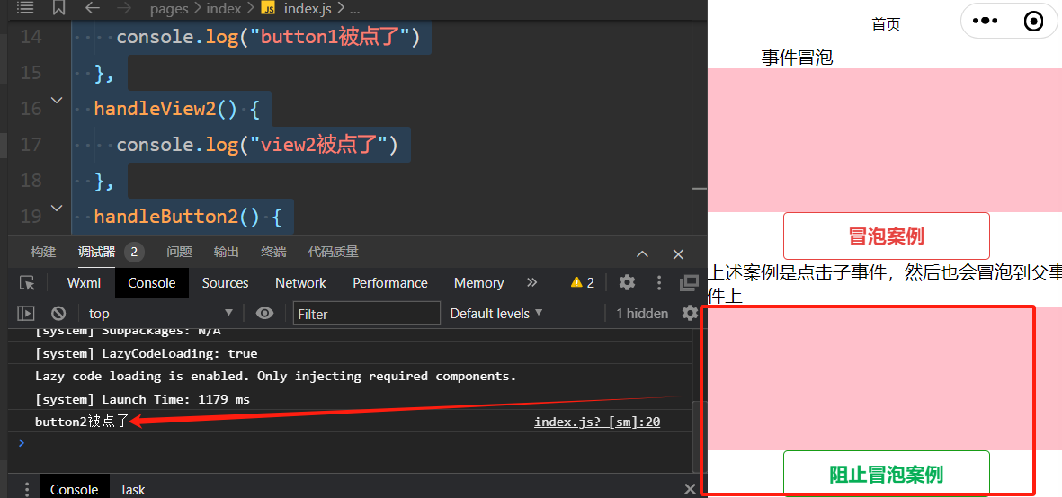 1 <!--index.wxml--> 2 3 <view>-------事件冒泡---------</view> 4 <view class="view1" bind:tap="handleView1"></view> 5 <button type="warn" plain bind:tap="handleButton1">冒泡案例</button> 6 <view>上述案例是点击子事件,然后也会冒泡到父事件上</view> 7 <view class="view1" bind:tap="handleView2"></view> 8 <button type="primary" plain catch:tap="handleButton2">阻止冒泡案例</button> 9 10 11 12 <view style="height:300rpx;display: flex;justify-content: center;align-items: center; background-color: pink;" bind:tap="handleView1"> 13 <button type="warn" plain bind:tap="handleButton1">冒泡案例</button> 14 15 </view> 16 //catch 17 <view style="height:300rpx;display: flex;justify-content: center;align-items: center; background-color: orange;" bind:tap="handleView2"> 18 <button type="primary" plain catch:tap="handleButton2">阻止事件冒泡</button> 19 </view> 20 21 ******************************** 22 样式 23 24 .view1{ 25 height: 300rpx; 26 display: flex; 27 justify-content: center; 28 align-items: center; 29 background-color: pink; 30 } 31 32 33 ****************** 34 js 35 36 Page({ 37 38 handleView1() { 39 console.log("view1被点了") 40 41 }, 42 handleButton1() { 43 console.log("button1被点了") 44 }, 45 handleView2() { 46 console.log("view2被点了") 47 }, 48 handleButton2() { 49 console.log("button2被点了") 50 }, 51 })
