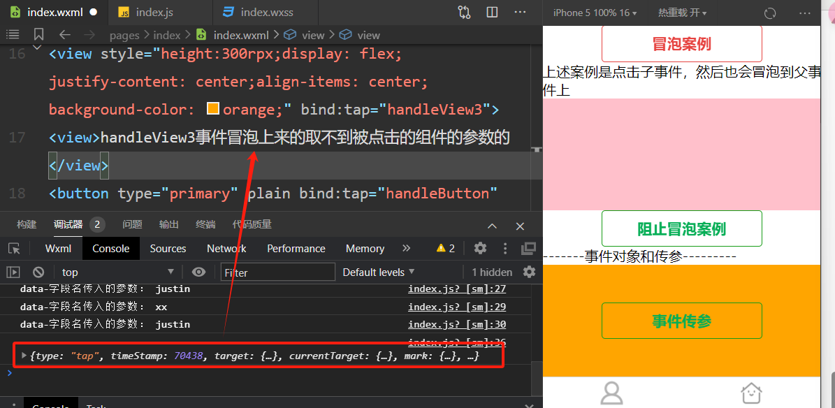 1 <view style="height:300rpx;display: flex;justify-content: center;align-items: center; background-color: orange;" bind:tap="handleView3"> 2 <view>handleView3事件冒泡上来的取不到被点击的组件的参数的</view> 3 <button type="primary" plain bind:tap="handleButton" data-name="justin" data-xx="xx" mark:name="lqz">事件传参</button> 4 </view> 5 6 7 *************************************** 8 js 9 10 handleButton(event){ 11 console.log(event) 12 console.log('mark传入的参数:',event.mark.name) 13 console.log('data-字段名传入的参数:',event.currentTarget.dataset.xx) 14 console.log('data-字段名传入的参数:',event.currentTarget.dataset.name) 15 16 console.log('data-字段名传入的参数:',event.target.dataset.xx) 17 console.log('data-字段名传入的参数:',event.target.dataset.name) 18 // mark 19 // target:dataset 20 // currentTarget:dataset 21 }, 22 handleView3(event){ 23 console.log(event) 24 }