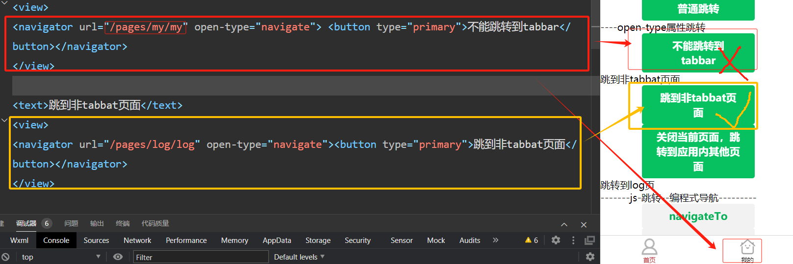 <navigator url="/pages/my/my" open-type="navigate"> <button type="primary">不能跳转到tabbar</button></navigator>