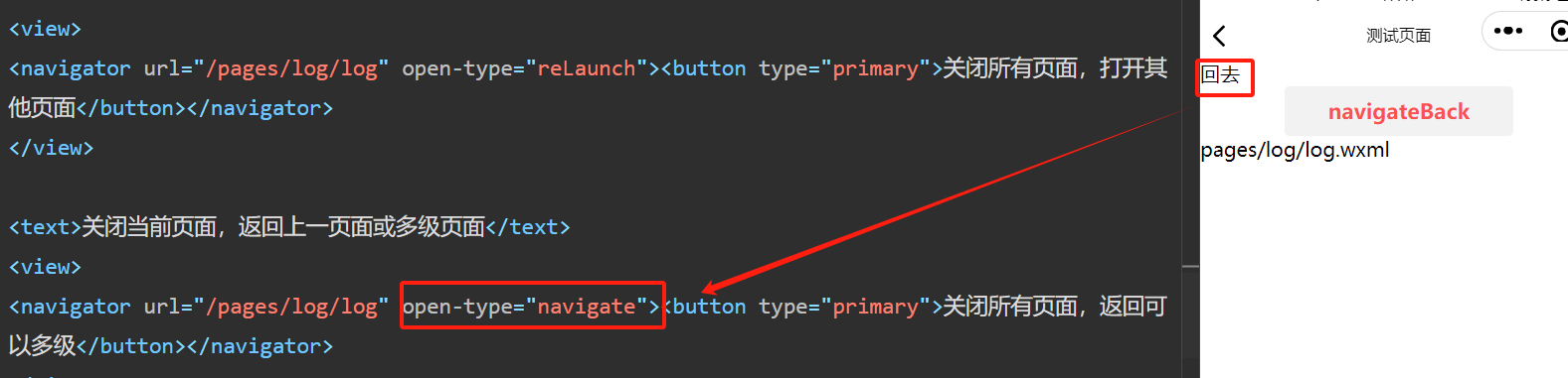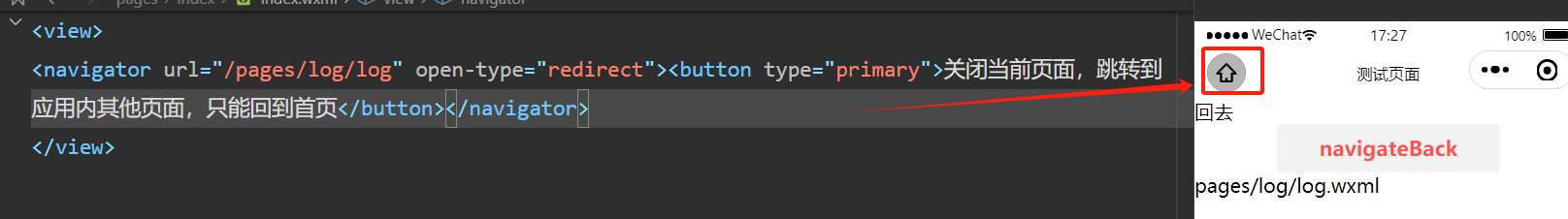 <navigator url="/pages/log/log" open-type="redirect"><button type="primary">关闭当前页面,跳转到应用内其他页面,只能回到首页</button></navigator>
