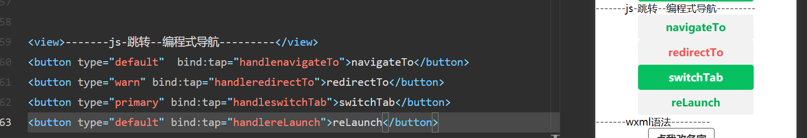 -------log页面 <button type="warn" bind:tap="handlenavigateBack">navigateBack</button> # 3 index.js handlenavigateTo(){ wx.navigateTo({ url: '/pages/log/log', }) }, handleredirectTo(){ wx.redirectTo({ url: '/pages/log/log', }) }, handleswitchTab(){ wx.switchTab({ url: '/pages/my/my', }) }, handlereLaunch(){ wx.reLaunch({ url: '/pages/log/log', }) },