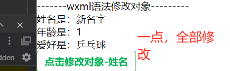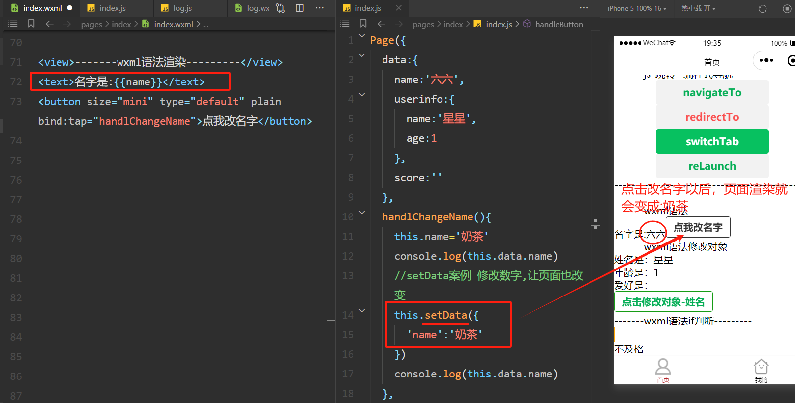 1 wxml 2 3 <text>名字是:{{name}}</text> 4 <button size="mini" type="default" plain bind:tap="handlChangeName">点我改名字</button> 5 6 7 --------------- 8 js 9 10 Page({ 11 data:{ 12 name:'六六', 13 }, 14 15 handlChangeName(){ 16 this.name='奶茶' 17 console.log(this.data.name) 18 19 //setData案例 修改数字,让页面也改变 20 this.setData({ 21 'name':'奶茶' 22 }) 23 console.log(this.data.name) 24 }, 25 })
