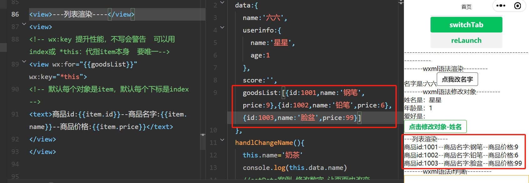 1 # 1 基本使用 2 ## 1.1 js 3 data: { 4 goodsList:[{id:1001,name:'钢笔',price:9},{id:1002,name:'铅笔',price:6},{id:1003,name:'脸盆',price:99}] 5 }, 6 ##1.2 wxml 7 8 <view> 9 <!-- wx:key 提升性能,不写会警告 可以用 index或 *this:代指item本身 要唯一--> 10 <view wx:for="{{goodsList}}" wx:key="*this"> 11 <!-- 默认每个对象是item,默认每个下标是index --> 12 <!-- <text>商品id:{{item.id}}--商品名字:{{item.name}}--商品价格:{{item.price}}</text> --> 13 </view> 14 </view> 15 ------------------------------------------ 16 17 # 2 修改wx:for-index wx:for-item 18 <view> 19 <view wx:for="{{goodsList}}" wx:key="*this" wx:for-item="info"> 20 <!-- 修改默认index和item--wx:for-index wx:for-item --> 21 <text>商品id:{{info.id}}--商品名字:{{info.name}}--商品价格:{{info.price}}</text> 22 </view> 23 </view> 24 25 # 3 block 26 <block>商品id:{{info.id}}--商品名字:{{info.name}}--商品价格:{{info.price}}</block>
