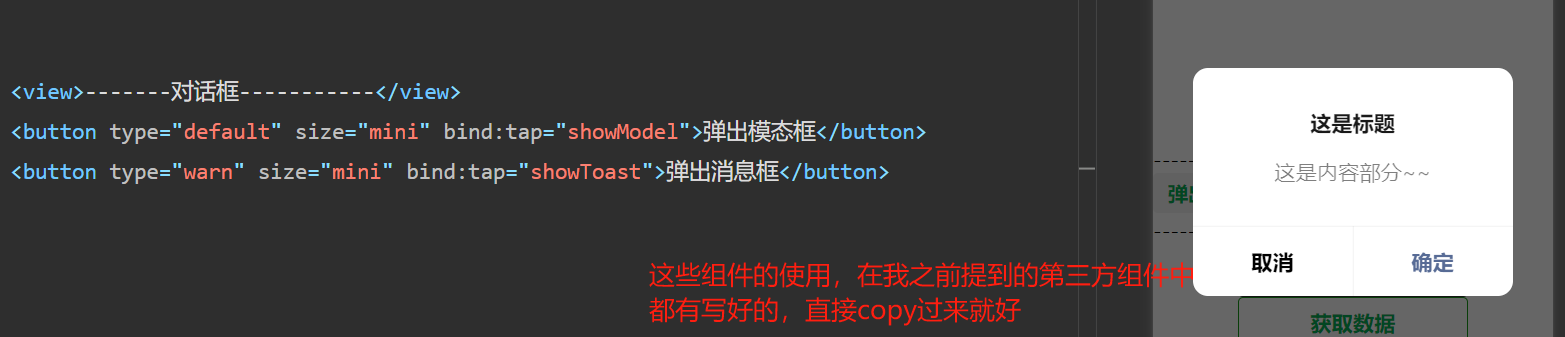 1 ##### wxml 2 <button type="default" size="mini" bind:tap="showModel">弹出模态框</button> 3 ### js ### 4 showModel(){ 5 wx.showModal({ 6 title: '这是标题', 7 content: '这是内容部分~~', 8 complete: (res) => { 9 if (res.cancel) { 10 console.log('用户取消了') 11 } 12 13 if (res.confirm) { 14 console.log('用户确认了') 15 } 16 } 17 }) 18 }