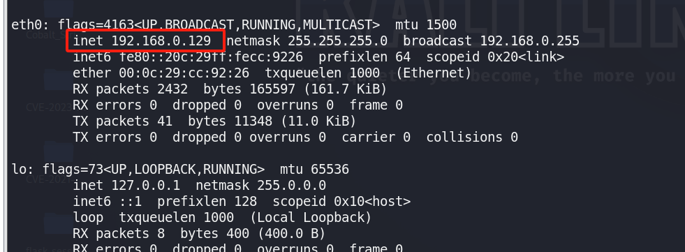 步骤2:在kali终端中,输入命令“ifconfig”,查看kali的IP地址与MAC地址,如图所示。