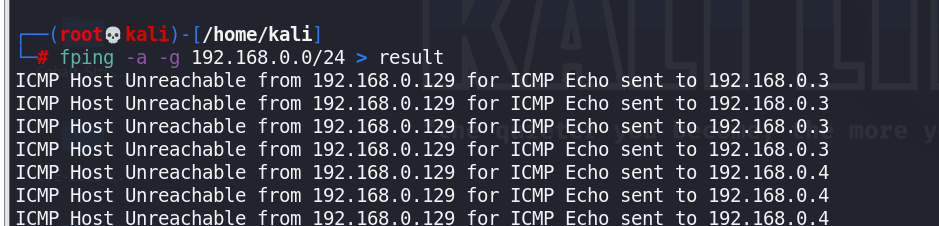 fping -a -g 192.168.0.0/24 > result